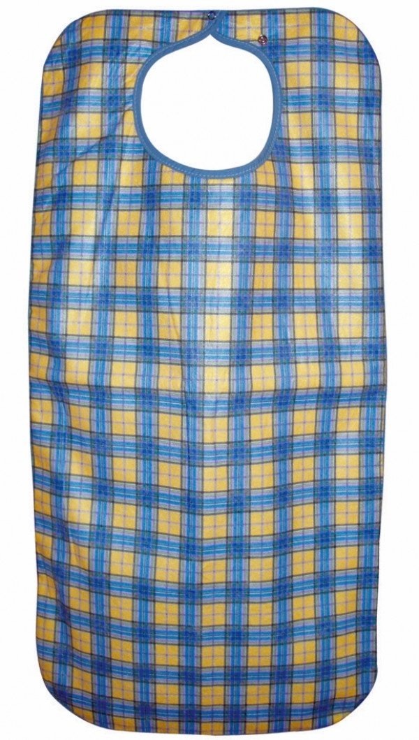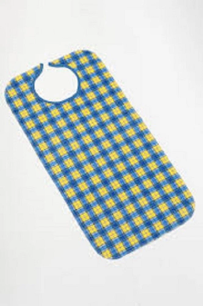 This Heavy Duty Re-Usable Adult Apron, featuring a cheerful yellow check pattern, is designed specifically for adults needing extra protection during mealtimes. Perfect for elderly individuals and caregivers, this apron serves as a reliable clothing protector, ensuring that clothes stay clean and dry from spills and stains.