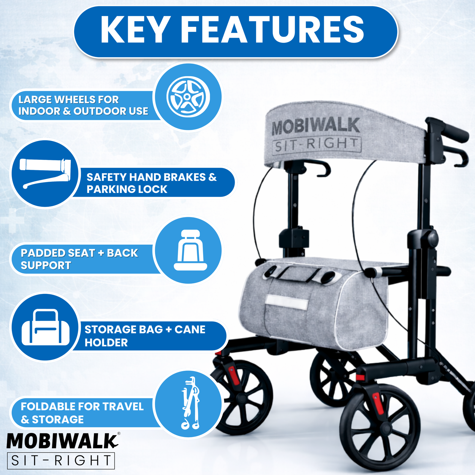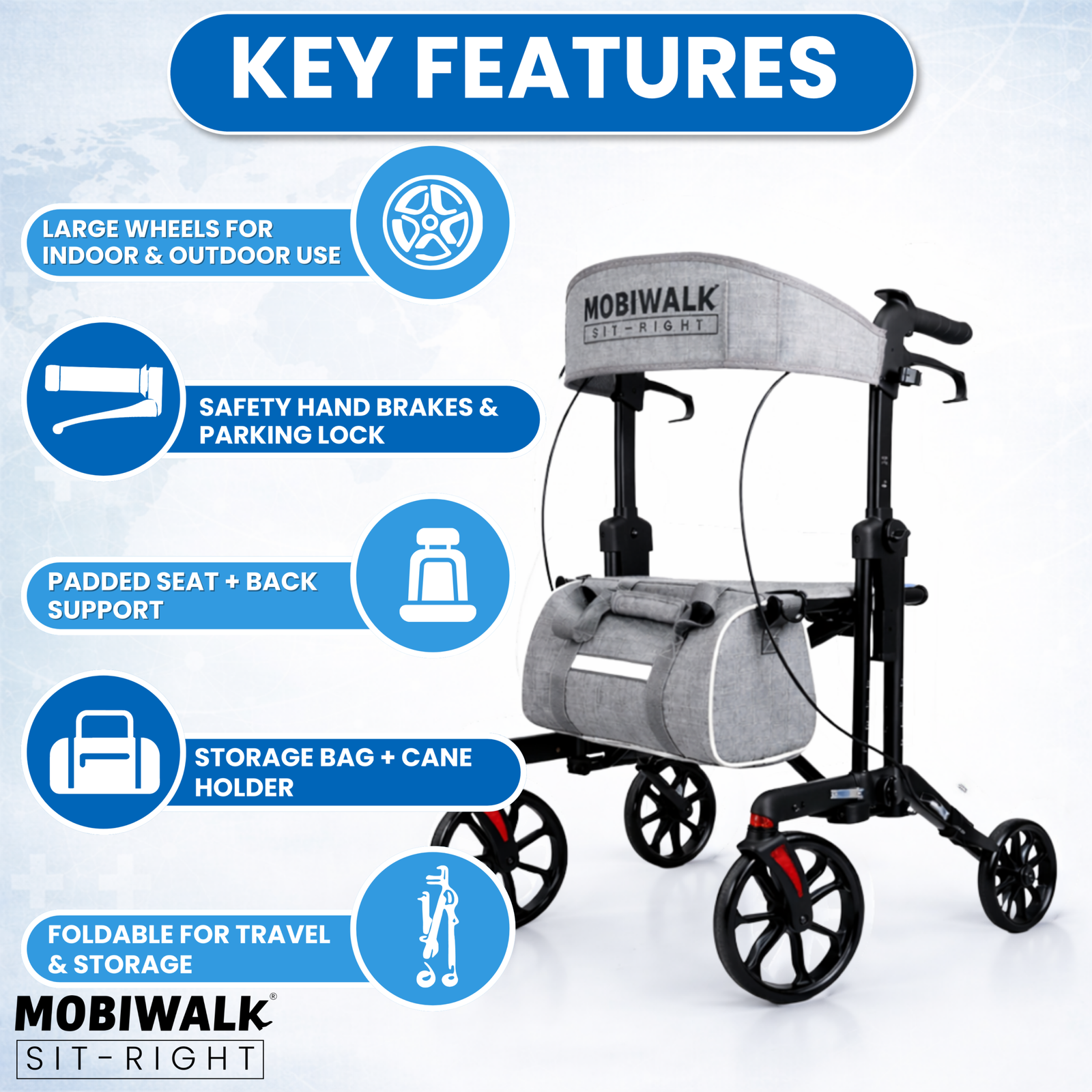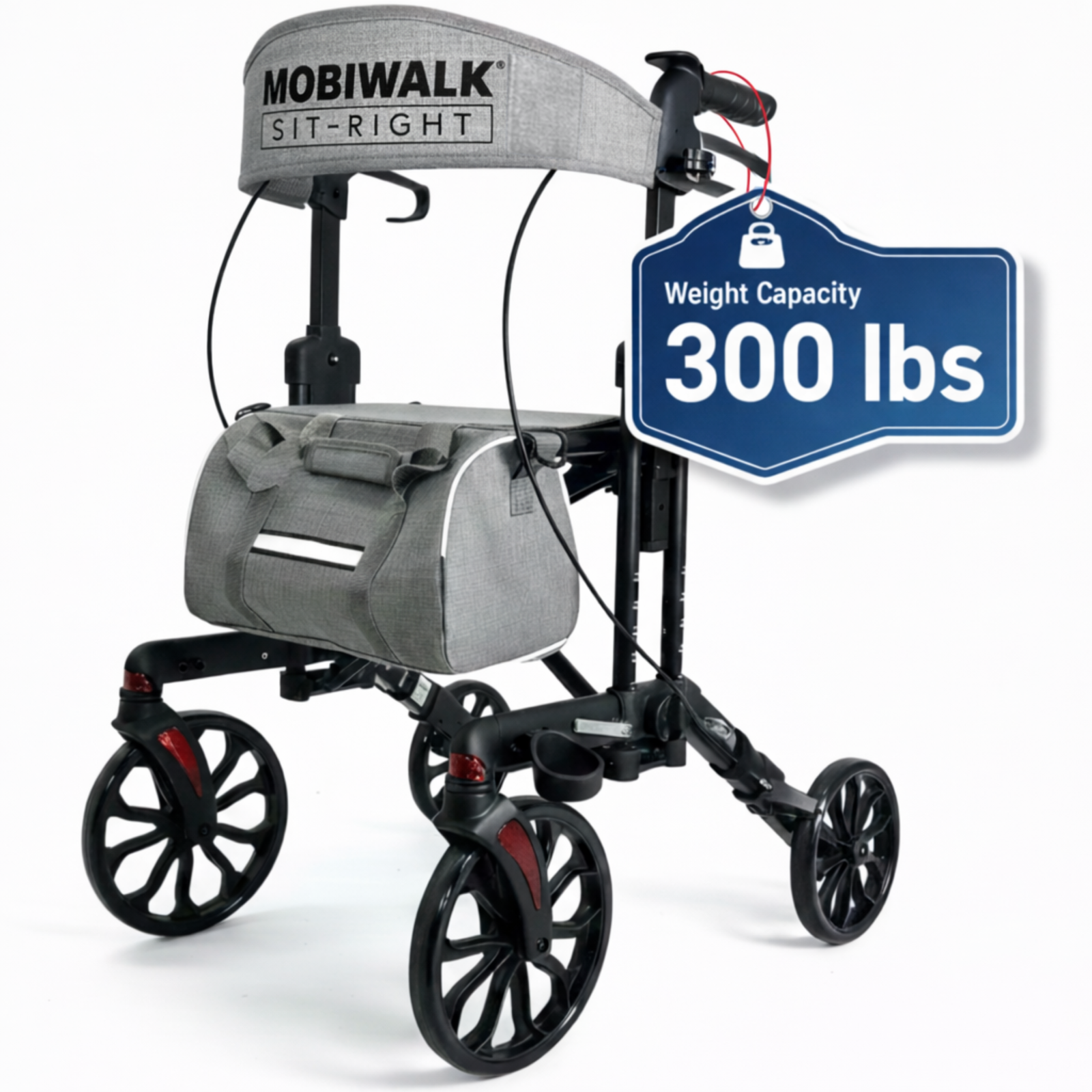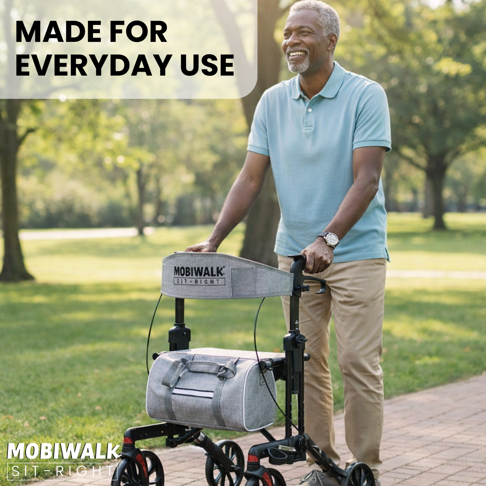 Designed for daily indoor and outdoor use, the MOBIWALK SIT-RIGHT rollator walker with seat delivers confident stability with a secure 4-wheel design and reliable support up to 136kg / 300lb. Enjoy comfort on the go with a supportive backrest and a premium, easy-access storage bag—ideal for carrying essentials while keeping your hands free.