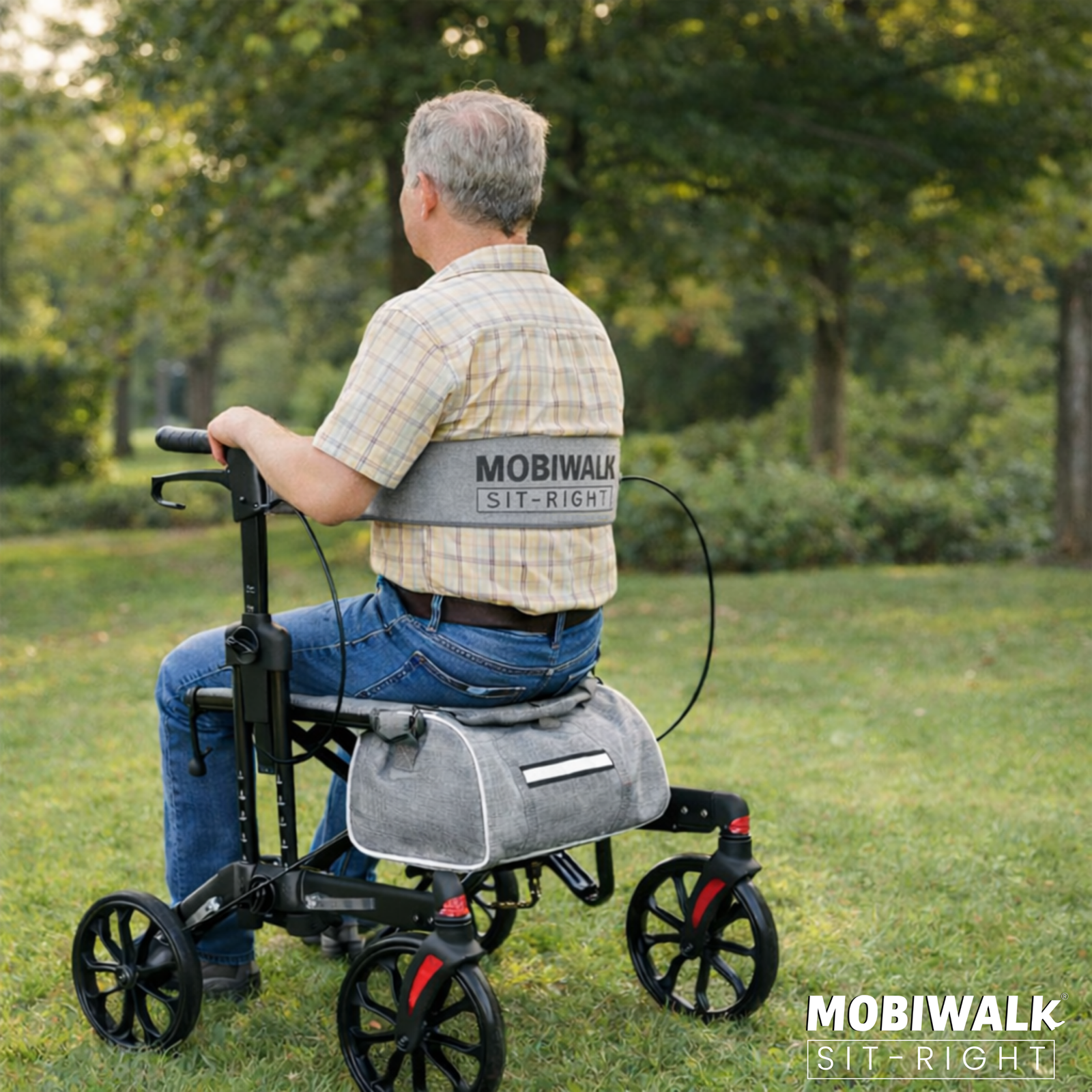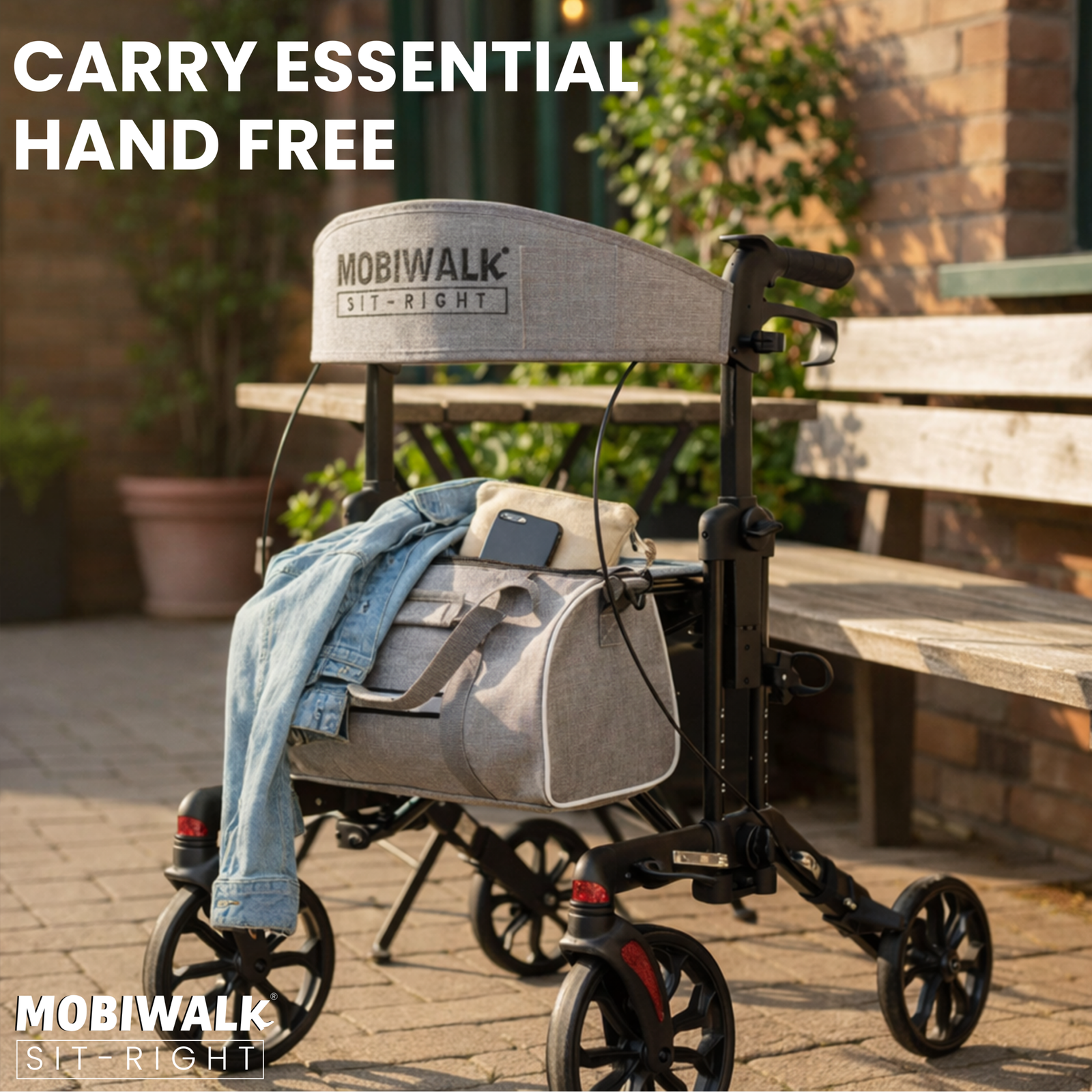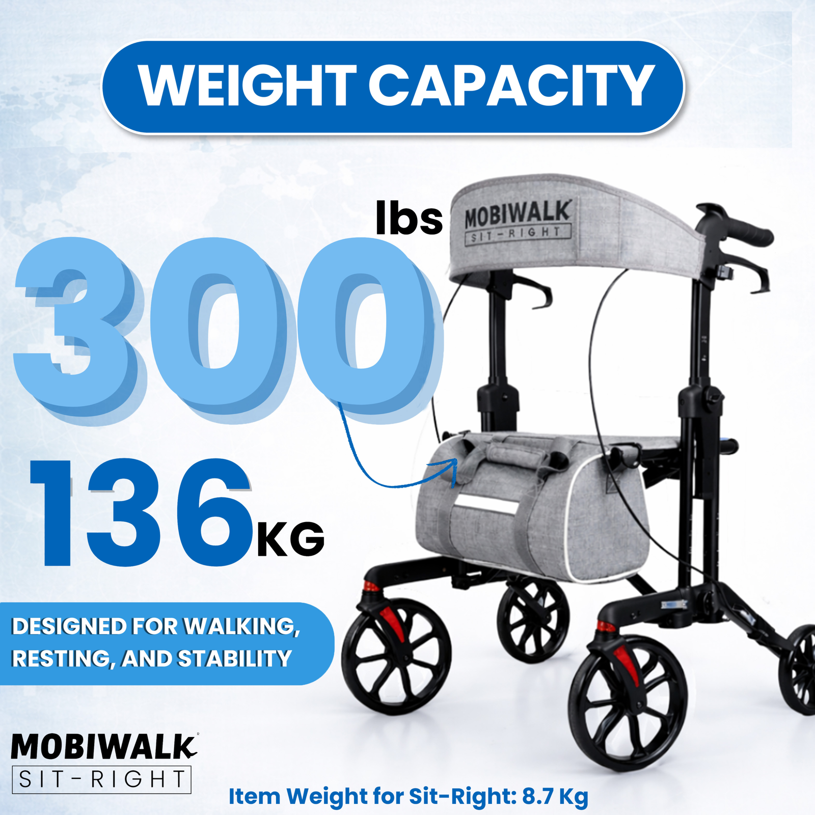 Designed for daily indoor and outdoor use, the MOBIWALK SIT-RIGHT rollator walker with seat delivers confident stability with a secure 4-wheel design and reliable support up to 136kg / 300lb. Enjoy comfort on the go with a supportive backrest and a premium, easy-access storage bag—ideal for carrying essentials while keeping your hands free.
