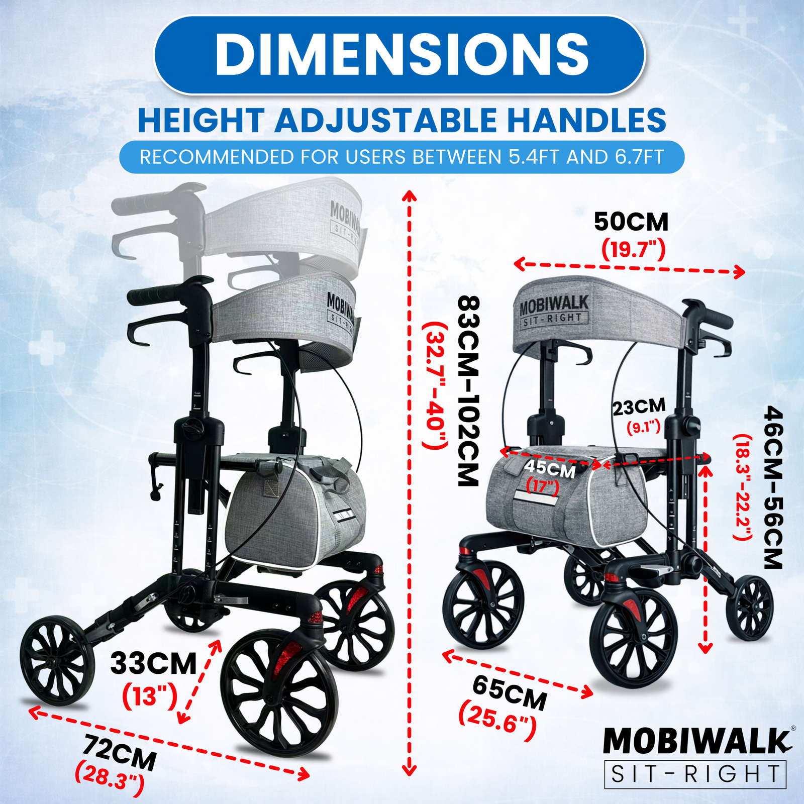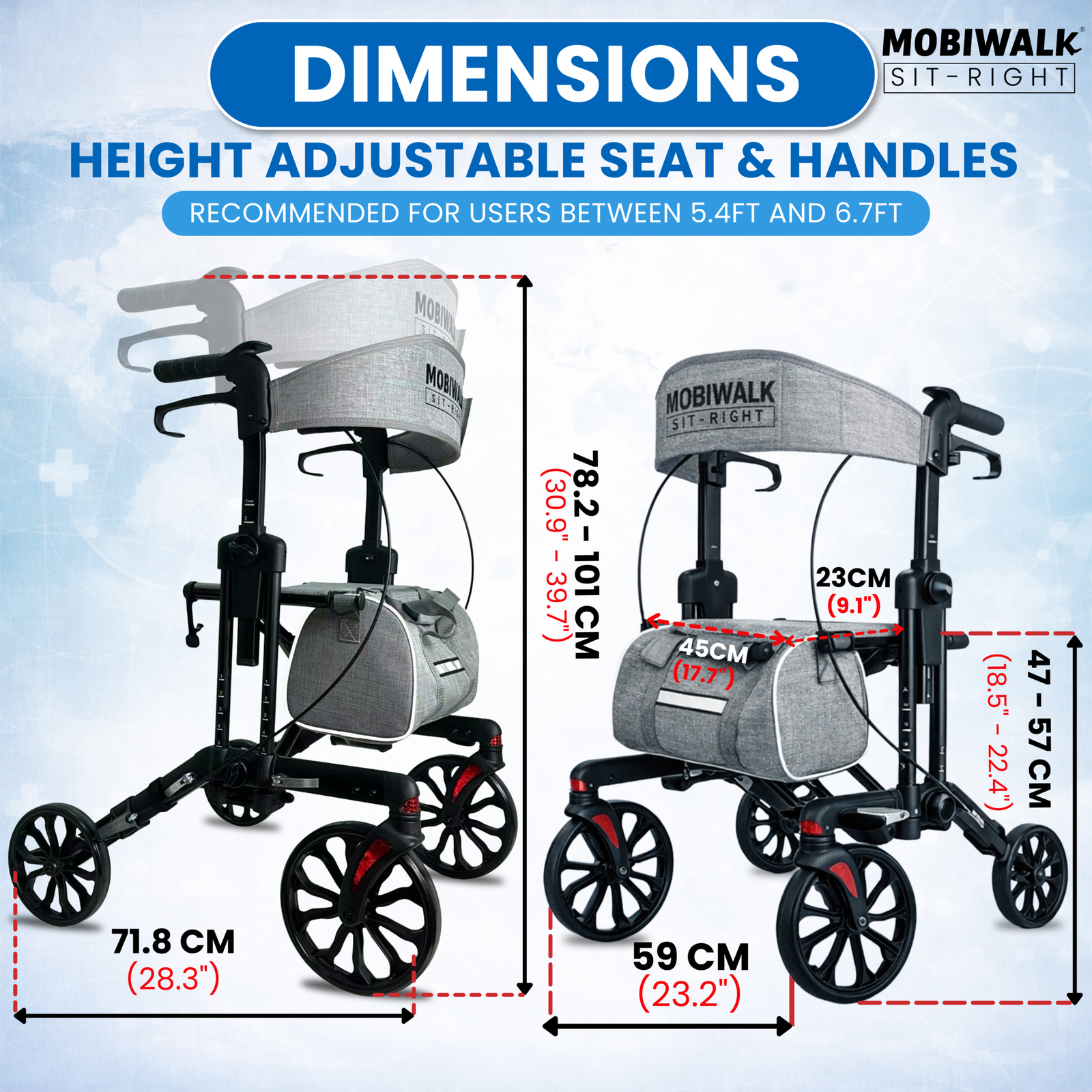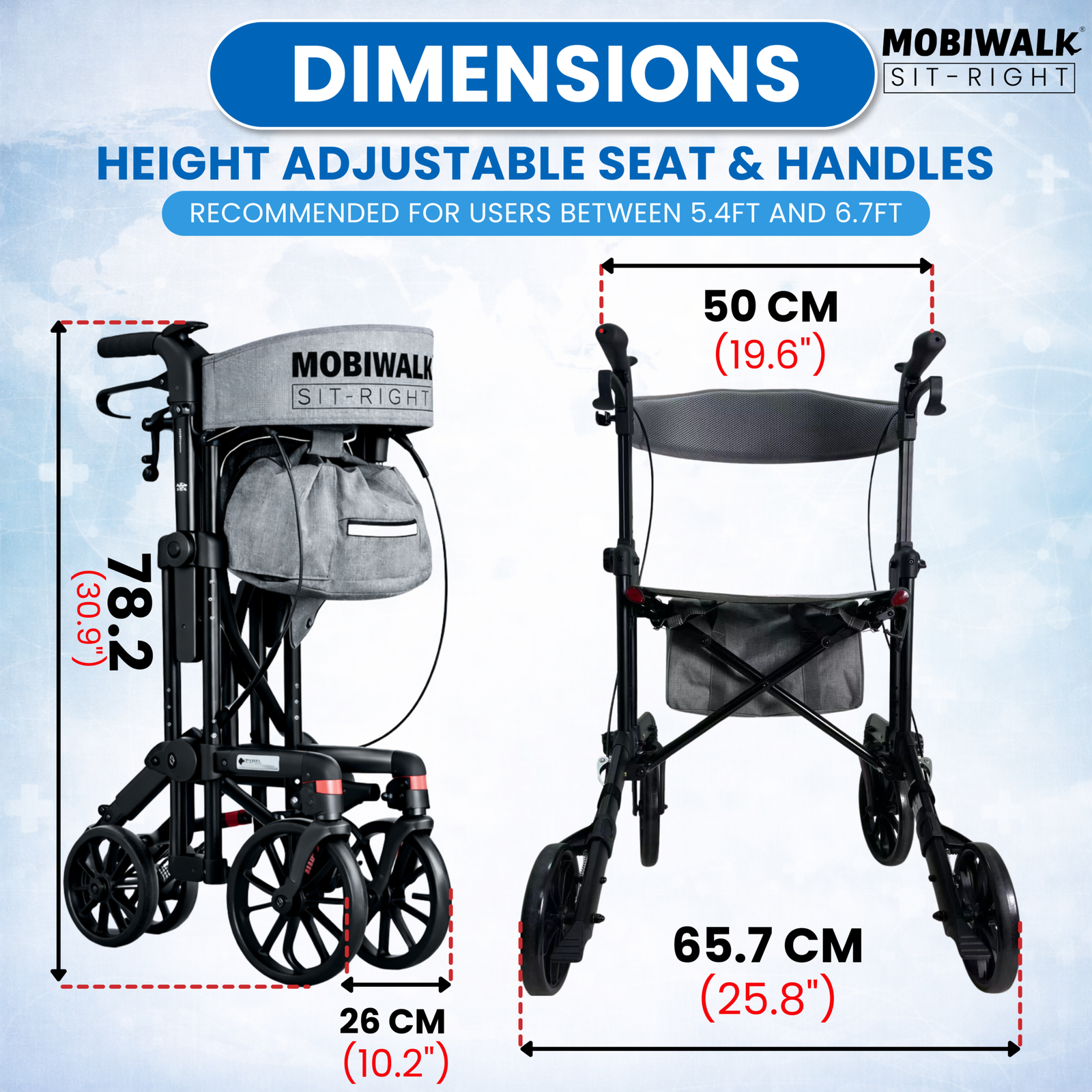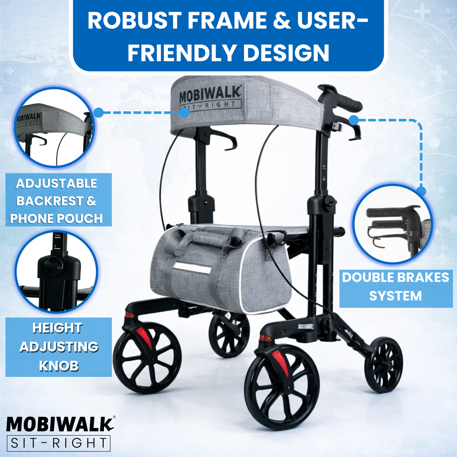 Designed for daily indoor and outdoor use, the MOBIWALK SIT-RIGHT rollator walker with seat delivers confident stability with a secure 4-wheel design and reliable support up to 136kg / 300lb. Enjoy comfort on the go with a supportive backrest and a premium, easy-access storage bag—ideal for carrying essentials while keeping your hands free.