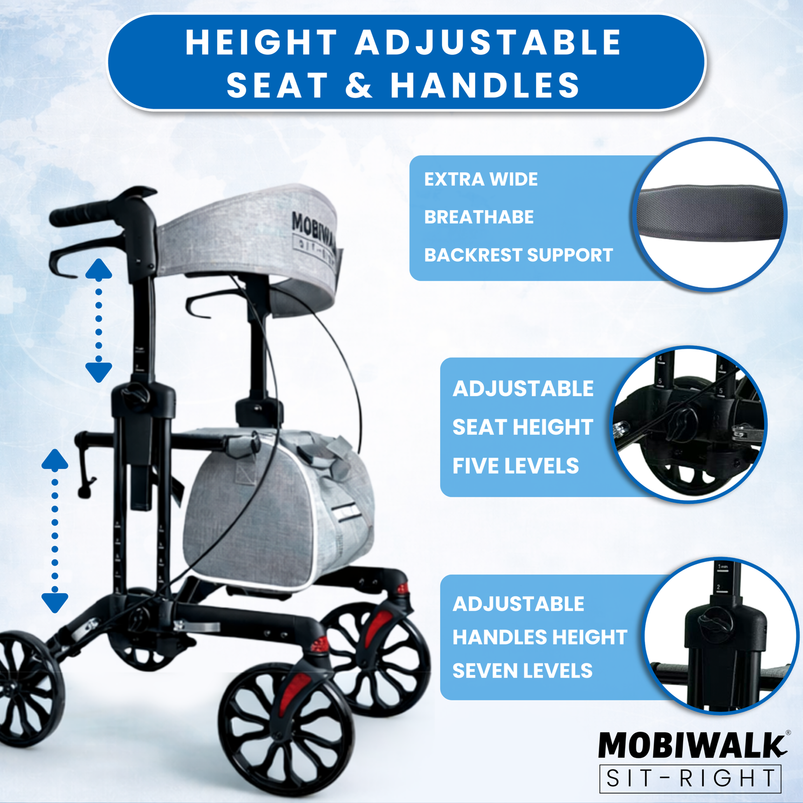 Take comfortable breaks anytime with a built-in, height-adjustable seat designed to help you find your “just right” sitting position. The supportive backrest adds stability and comfort while resting, making MOBIWALK SIT-RIGHT a dependable rollator walker with seat for daily indoor and outdoor mobility—ideal for seniors and anyone who wants confident walking plus reliable rest support.