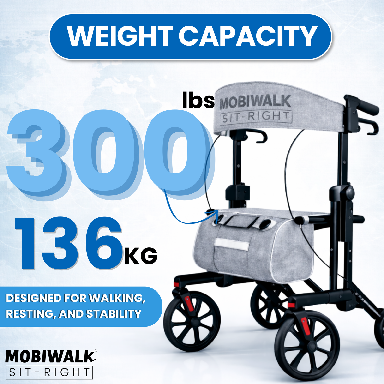 A: The MOBIWALK SIT-RIGHT supports up to 136 kg / 300 lbs (maximum safe load).