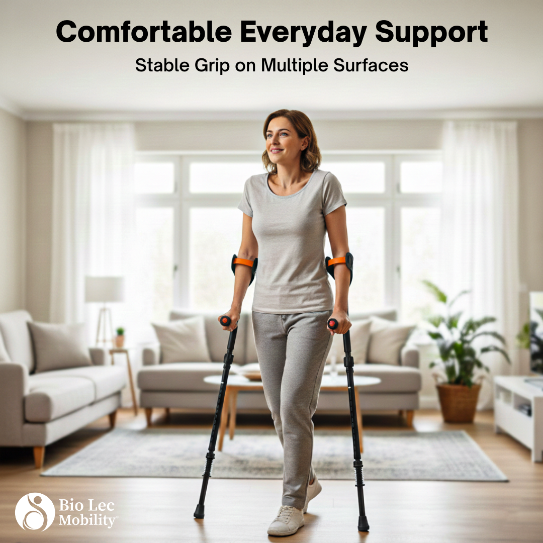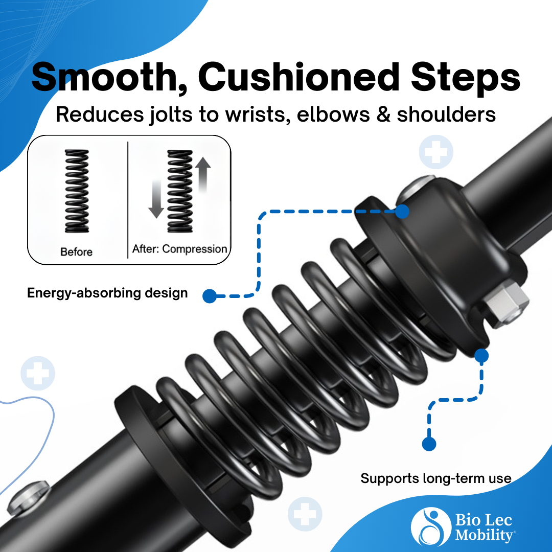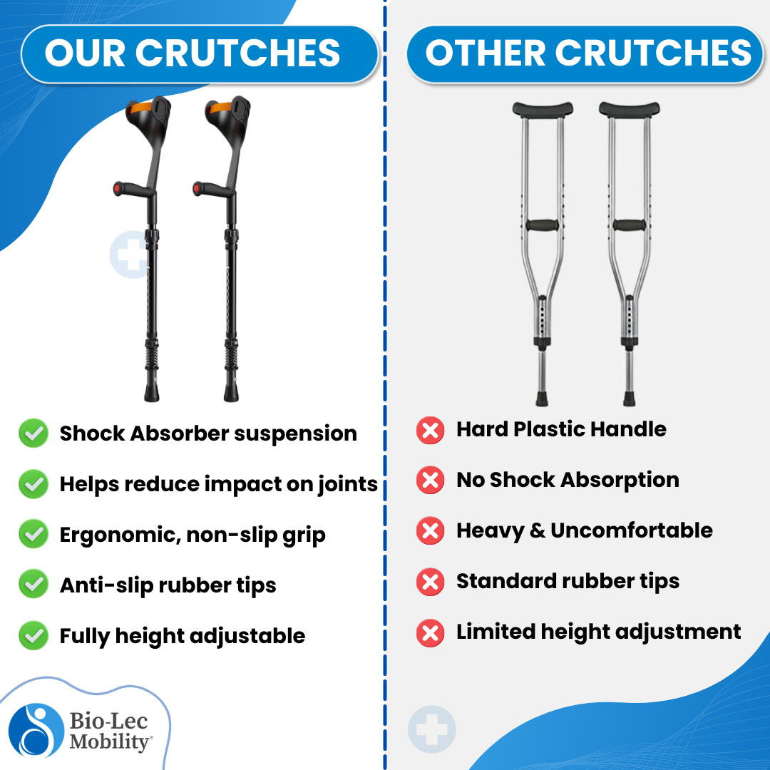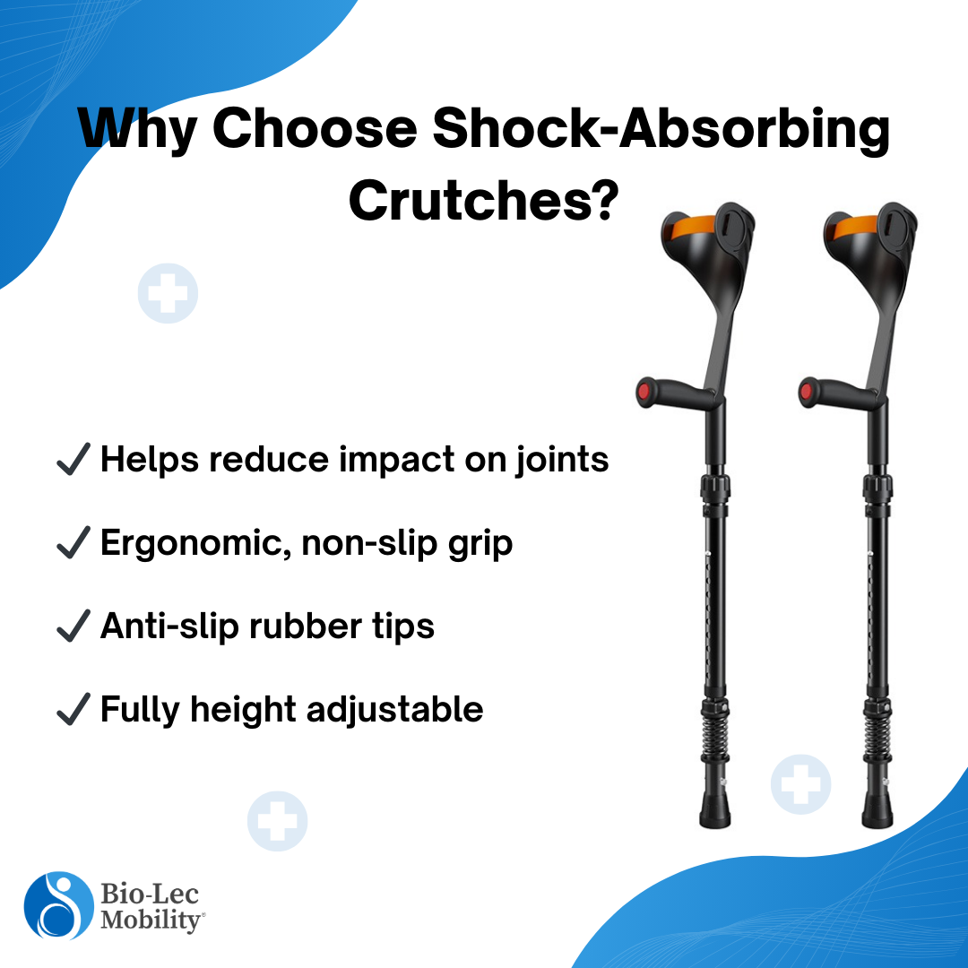 Comfort-focused shock absorbing forearm crutches designed to help reduce impact through the arms during walking. Features soft touch ergonomic handles, easy push-button height adjustment, and anti-slip rubber tips for a stable grip on common surfaces.