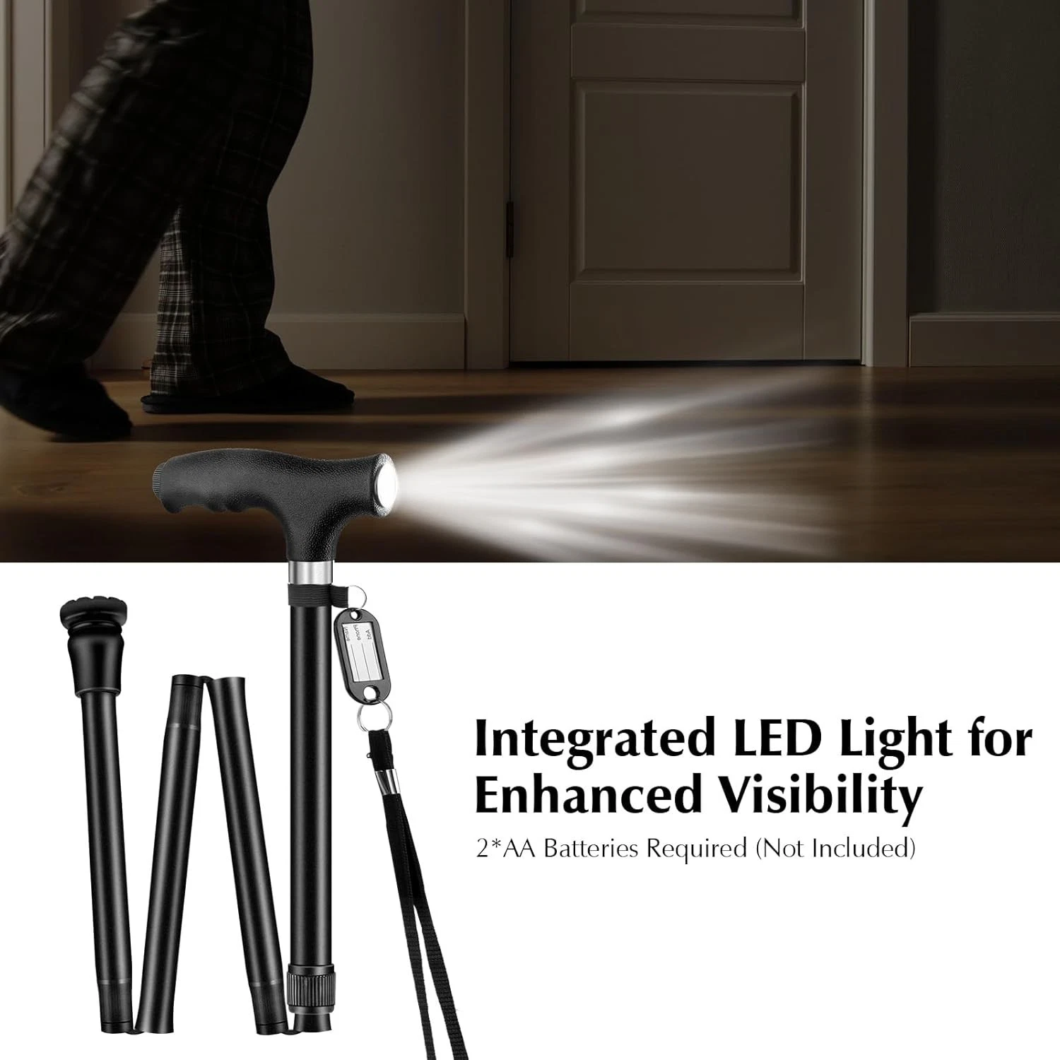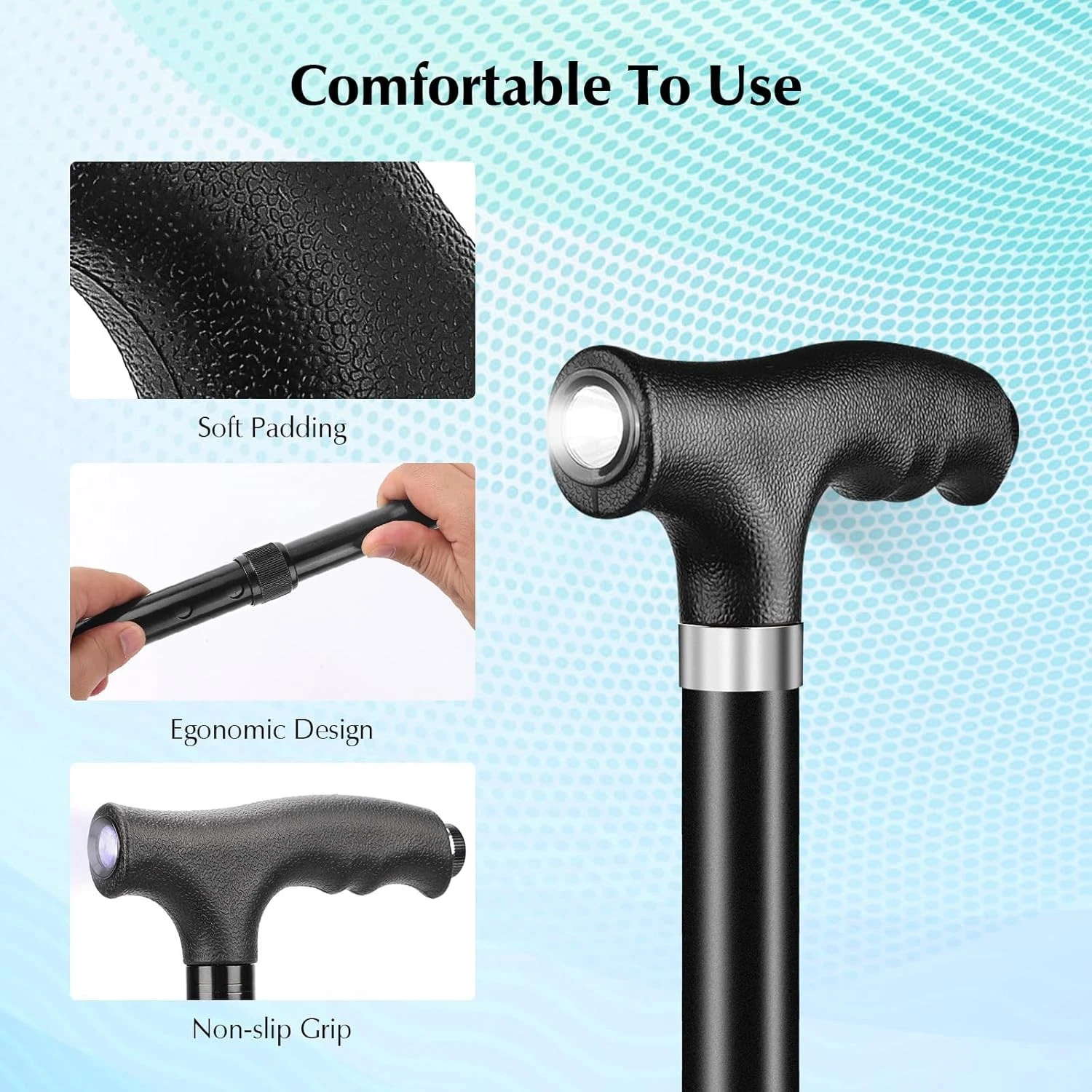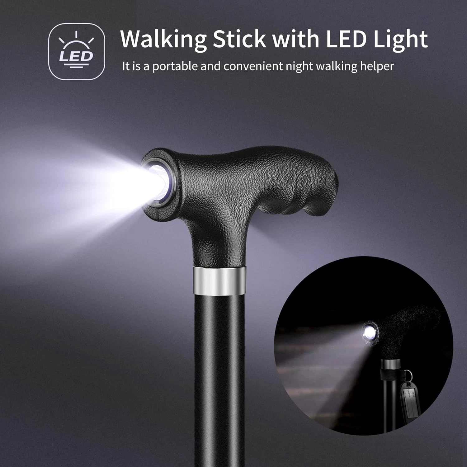 Walking Stick with LED Light, Ergonomic Handle, Rubber Base, and Adjustable Height